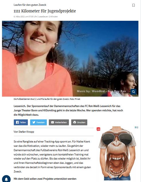 Die Damenmannschaft FC Rot-Weiss Lessenich im Endspurt! Knapp 1.000 Kilometer hat die Gruppe mit ihrem Spendenlauf zugunsten von Junges Theater Bonn und KIDsmiling – Fußballprojekt schon bis zum Wochenende gemeistert – und es mit ihrem super Projekt in den General-Anzeiger Bonn geschafft! Wir bedanken uns am heutigen Weltfrauentag bei den Damen von FC Rot-Weiss Lessenich für ihre starke Leistung. Gemeinsam sind wir stark!