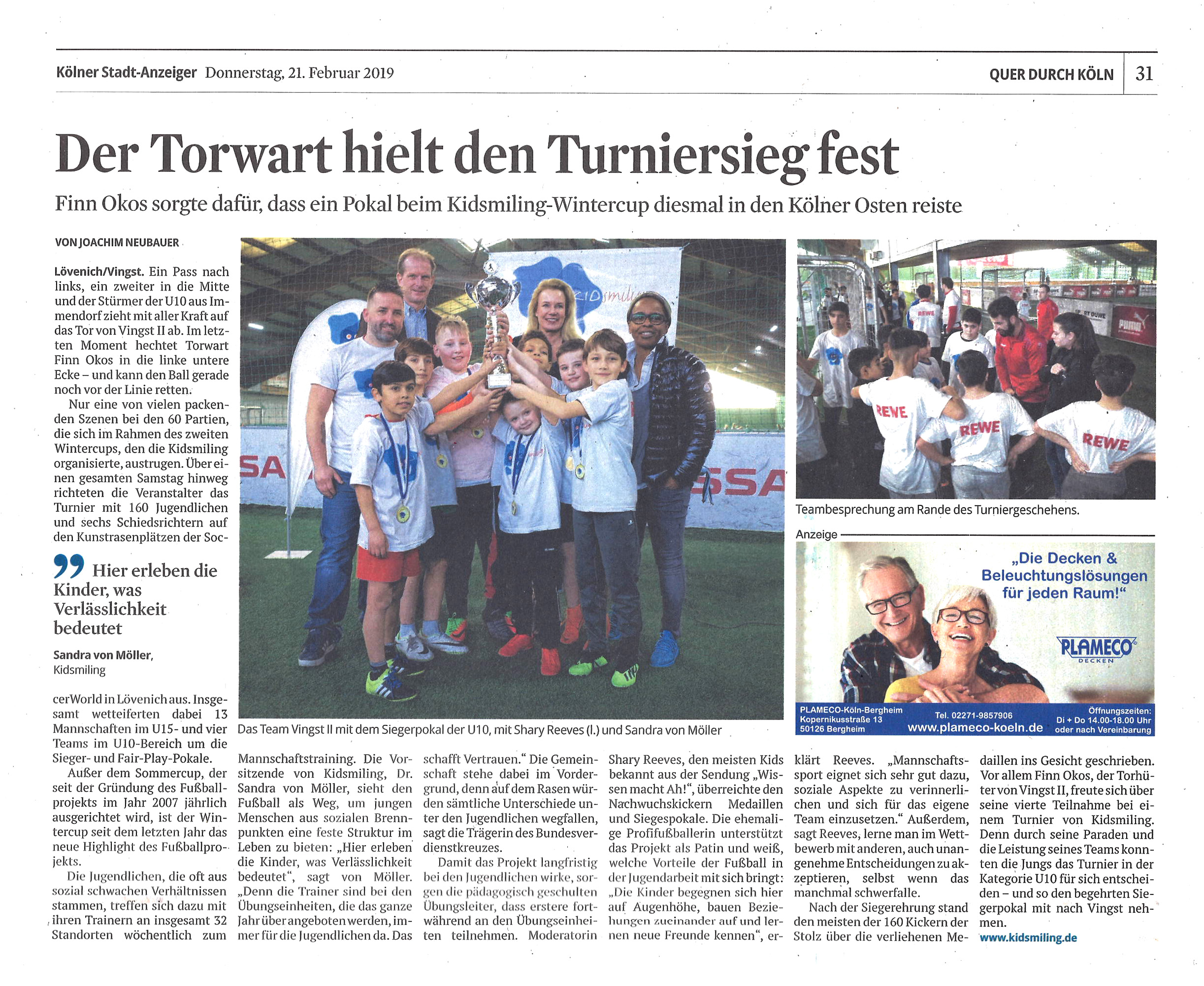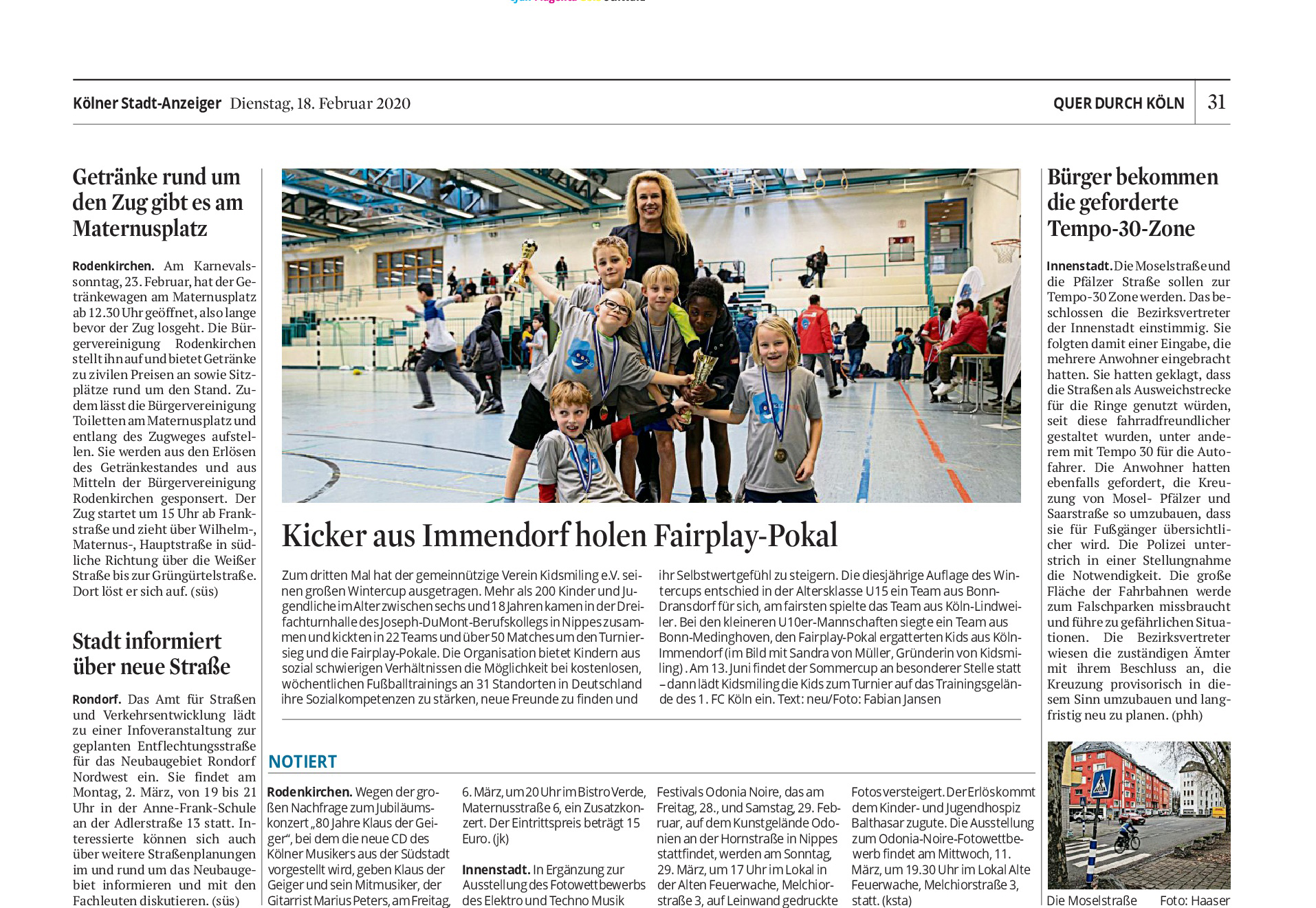 ,,Pänz stehen auf Turniere – 200 Teilnehmer beim KIDsmiling-Wintercup“, Kölner Wochenspiegel, 12.03.2019