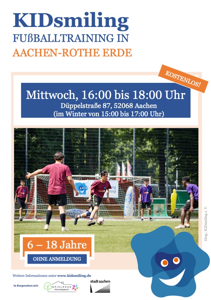 Am Standort Aachen-Rothe Erde findet du uns jede Woche Mittwoch auf dem Feld. Von 16:00 bis 18:00 Uhr im Sommer oder von 15 bis 17 Uhr im Winter kannst du dort von unseren Trainern neue Fußballskills lernen und kleine Turniere im Team gegeneinander spielen.