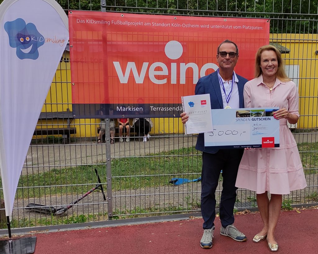 Am 26.08.2022 war unser Platzpate weinor GmbH & Co. KG zusammen mit Frau Dr. Sandra von Möller beim KIDsmiling – Training in Ostheim zu Besuch. Weinor GmbH & Co. KG – Geschäftsführer Thilo Weiermann überreichte einen Scheck in Höhe von 5000€. Durch die Platzpatenschaft ist die Finanzierung des Standortes für ein weiteres Jahr gesichert. Herzlichen Dank!