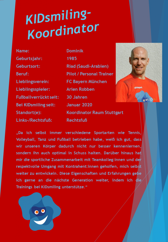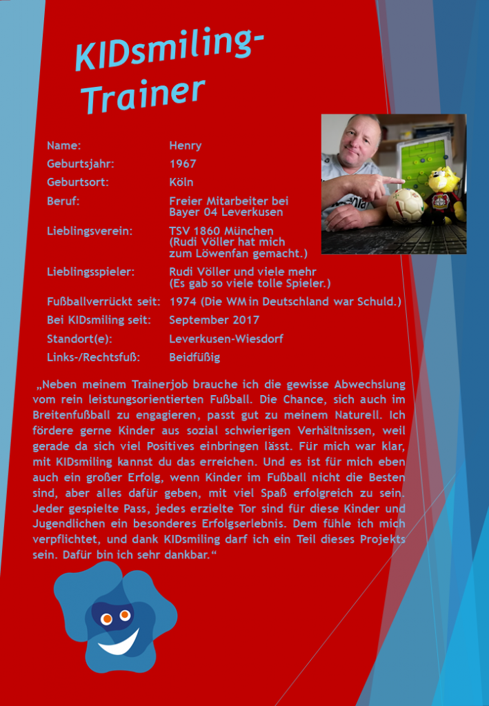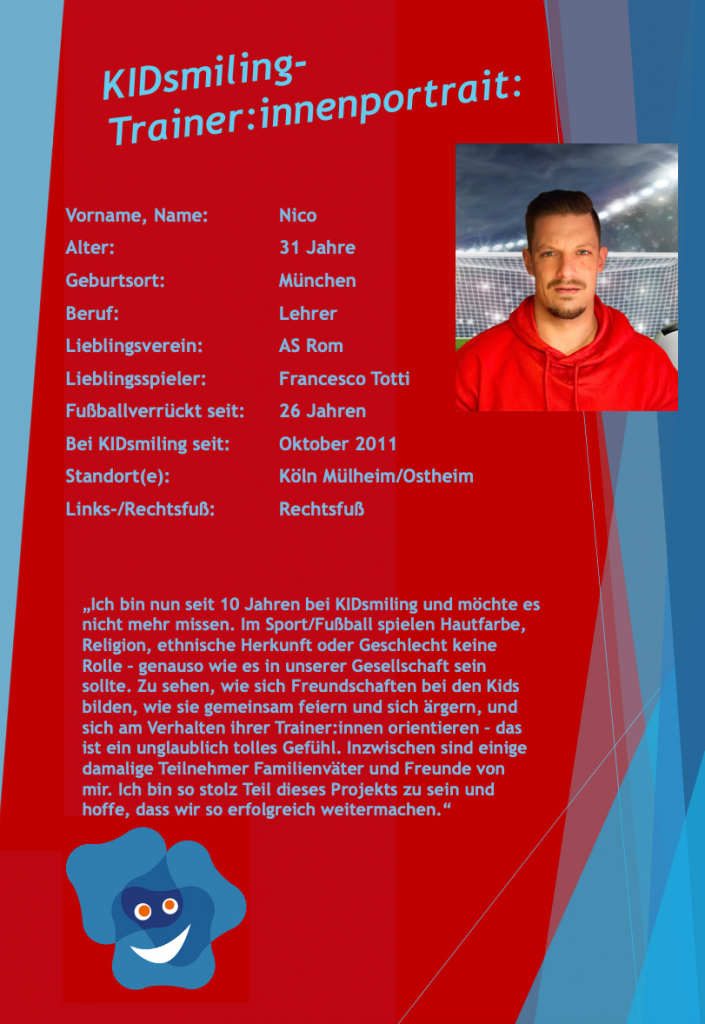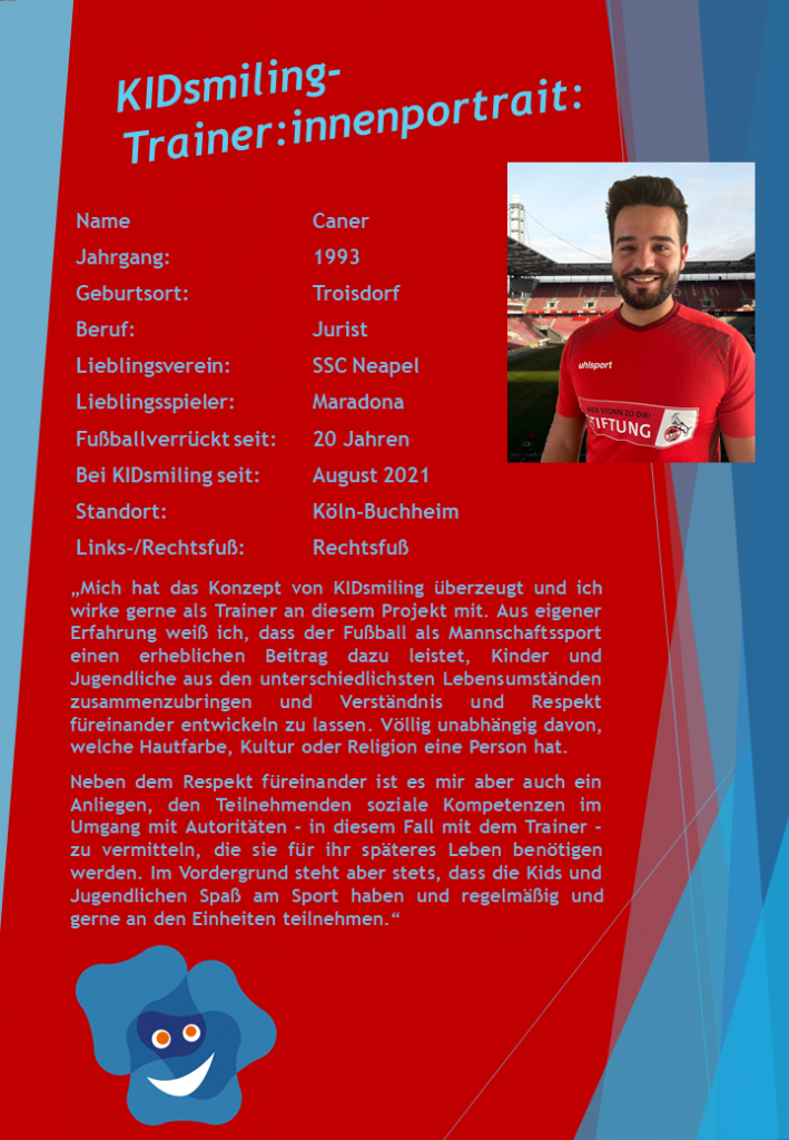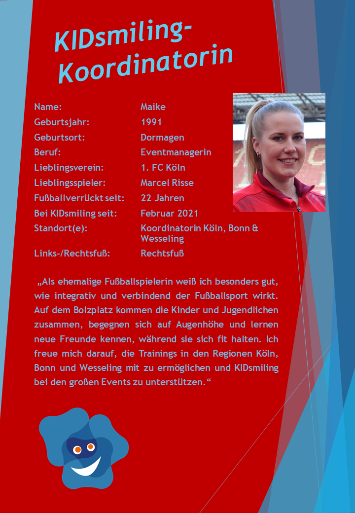 Wer sind die TrainerInnen, die wöchentlich die Trainings an unseren 29 Standorten in Köln, Düsseldorf, Leverkusen, Bonn, Stuttgart, Wesseling, Bergheim und Ludwigsburg begleiten? Hier stellen wir euch regelmäßig unsere KIDsmiling-TrainerInnen vor: