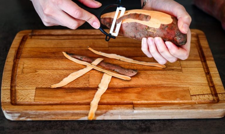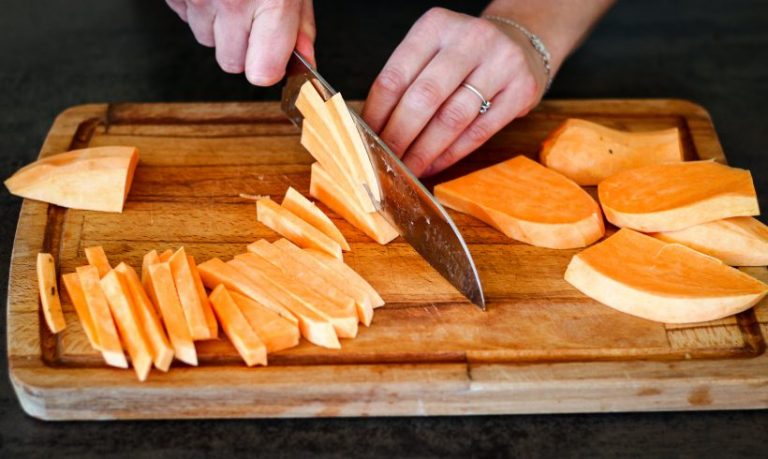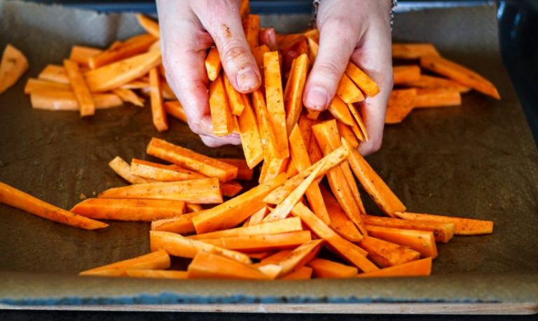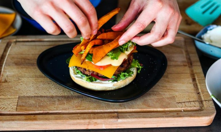 Pommes vorbereiten: Dazu den Backofen auf 220 Grad vorheizen und ein Backblech mit Backpapier auslegen. Süßkartoffeln schälen, in Pommesstreifen schneiden. Öl, Salz, Pfeffer und Rosmarin hinzugeben und gut vermischen. Im Backofen bei 220 Grad Ober-/Unterhitze ca. 15-20 Minuten backen und dann vorsichtig umdrehen.