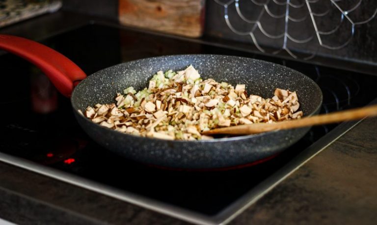 In einer Pfanne 1 EL Olivenöl erhitzen. Zwiebel- und Pilzwürfel anbraten.