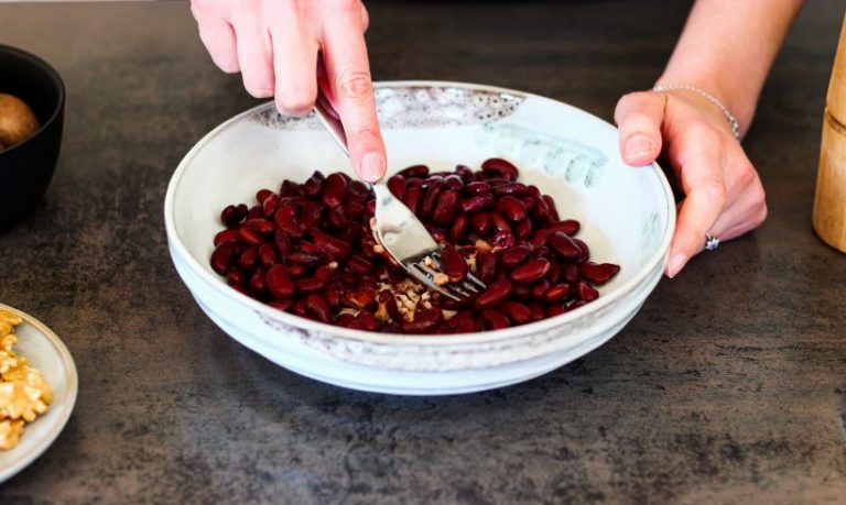 In einer großen Schüssel die abgetropften Kidneybohnen mit einer Gabel möglichst fein zerdrücken.