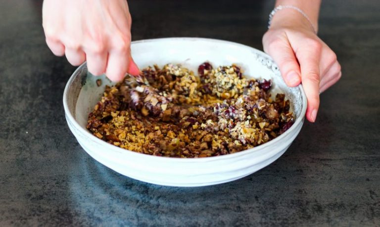 Dazu die angebratenen Zwiebeln und Pilze, Walnüsse, Semmelbrösel und Gewürze geben. Die Masse am besten mit den Händen gut verkneten. Die Gewürze müssen sich überall gleichmäßig verteilen. Mit Salz und Pfeffer abschmecken.