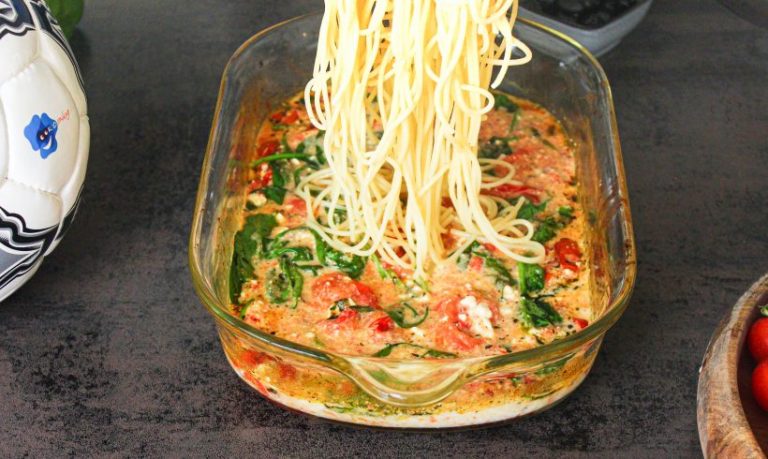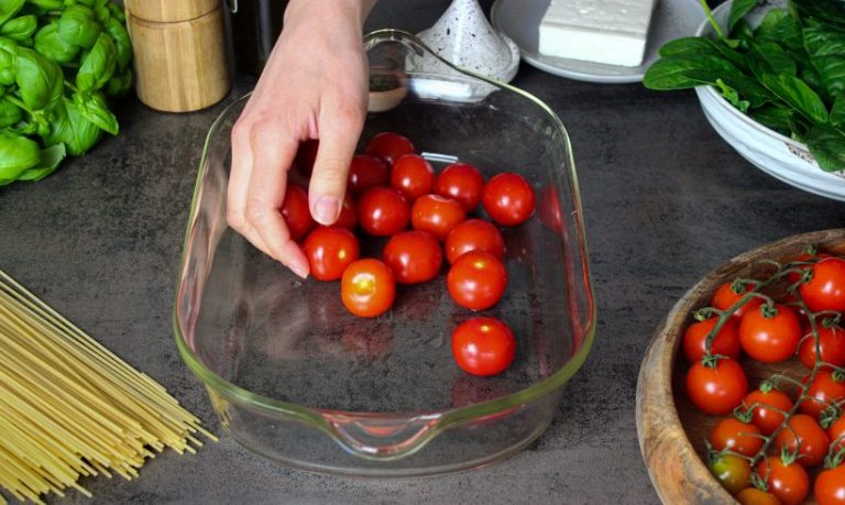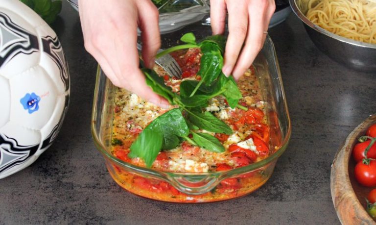 Nun werden die Tomaten und der Feta bei 200°C für ca. 20 – 25 Minuten im Ofen gebacken. In der Zwischenzeit die Pasta nach Packungsanweisung kochen. Wenn die Tomaten und der Feta fertig gebacken sind, kann man die Masse zerdrücken.