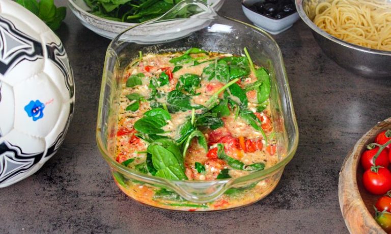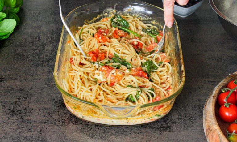 Den Spinat in die Sauce geben, weitere 5 Minuten in den Ofen stellen und die abgetropften Nudeln dazugeben. Die Oliven, einen Spritzer Zitrone und frisches Basilikum hinzufügen. Alles gut vermischen und abschmecken.