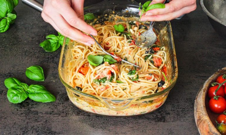 Fertig ist die gebackene Tomaten-Feta-Pasta aus dem Ofen!