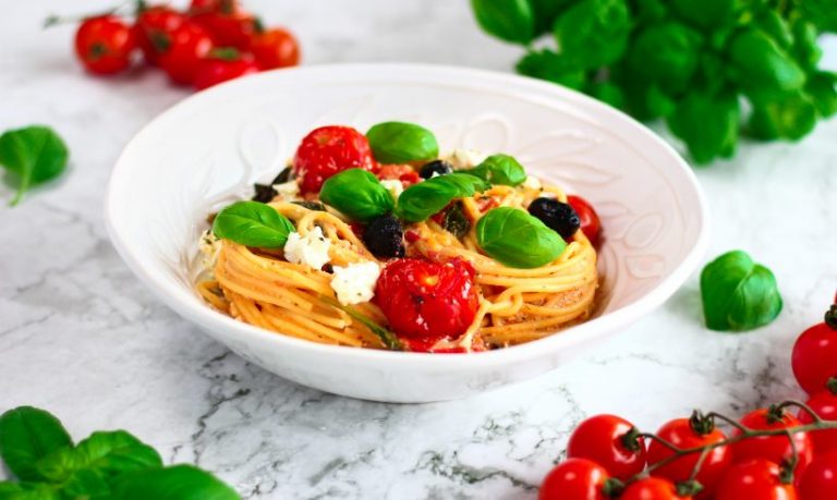 Pasta mit Feta und gebackenen Tomaten ist ein perfektes Gericht, um es mit Freunden oder der Familie zu teilen. Es ist sehr schnell und einfach zuzubereiten und so lecker, dass ihr träumen werdet! Ihr könnt das Rezept mit den Zutaten anpassen, die ihr bevorzugt. Zum Beispiel habe ich eine Hand voll Spinat und Oliven hinzugefügt.