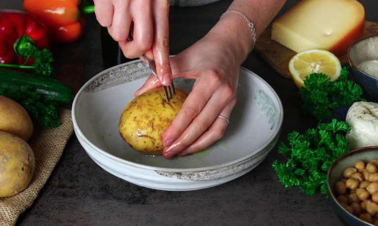 Backofen auf 220 °C vorheizen. Kartoffeln waschen und abtrocknen. Mit 2 EL Olivenöl einreiben, mit einer Gabel mehrfach anstechen, und jeweils in ein Stück Alufolie locker einwickeln. Auf ein Backblech legen und circa 50-60 Minuten im Ofen backen. Anschließend kurz abkühlen lassen.
