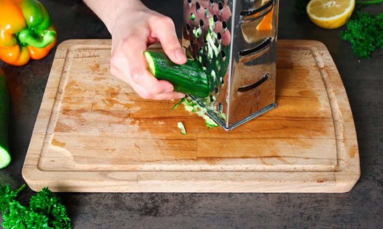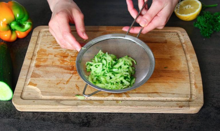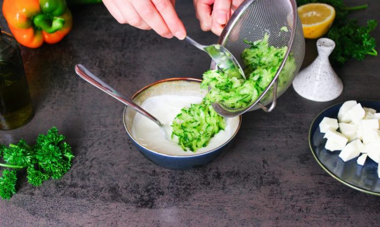Salatgurke waschen, putzen, grob raspeln und in einem Sieb abtropfen lassen. Knoblauchzehen schälen, fein hacken oder durch eine Knoblauchpresse drücken.