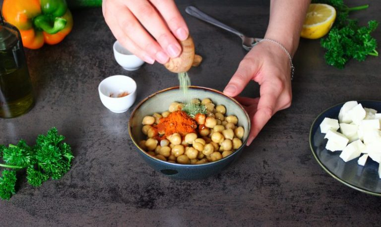 Währenddessen Paprika und Halloumi in Würfel schneiden. Kichererbsen in einem Sieb abgießen und in eine Schüssel geben. Die Kichererbsen mit Salz, Pfeffer, Öl, Rosmarin und süßer Paprika würzen. In eine Pfanne mit einem Spritzer Öl und einer Knoblauchzehe geben. Zuerst die Paprika und die Kichererbsen anbraten, dann die Erbsen und schließlich den Halloumi hinzufügen. Bei starker Hitze ca. 10 Minuten braten.