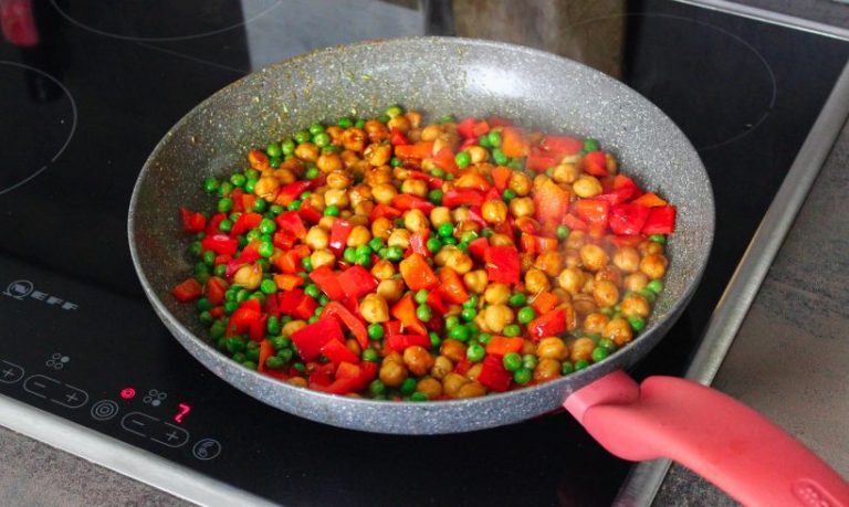 Möhren und Tomaten in Scheiben schneiden. Paprika waschen, entkernen und in Stücke schneiden. Pilze trocken abreiben und in dicke Scheiben schneiden. Eine Pfanne auf mittlerer Stufe erhitzen und Gemüse darin nacheinander 4–5 Minuten von jeder Seite anbraten.