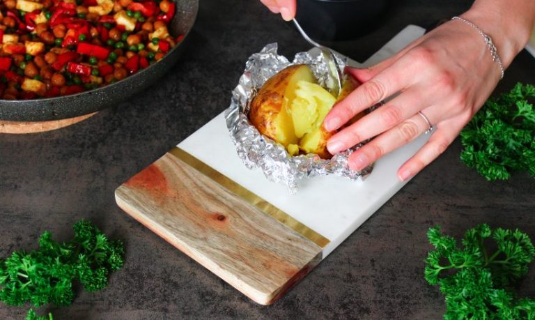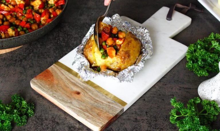 Die Kartoffel auf einen Teller oder eine Aluschale legen und mit dem angebratenen Gemüse füllen.