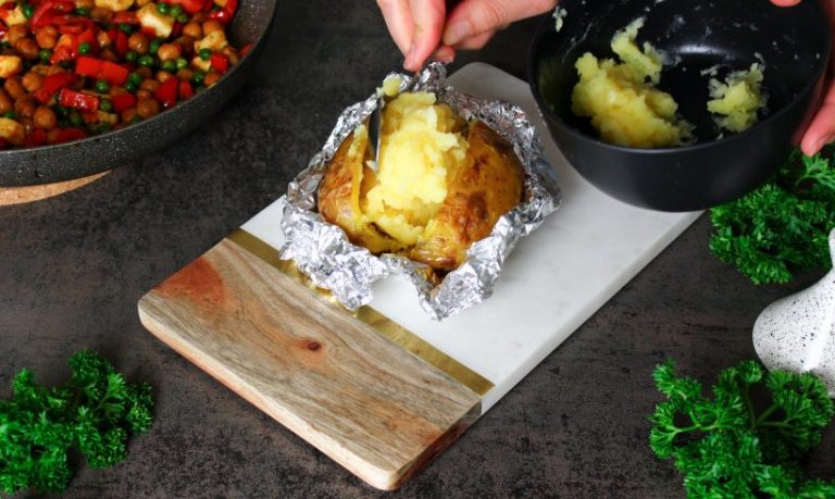 Nach insgesamt einer Stunde die Kartoffeln aus dem Backofen nehmen, auf ein Schneidebrett legen und in der Mitte so teilen, dass ca. 1 cm die beiden Kartoffelhälften noch verbindet (sie sollte nicht auseinanderfallen).