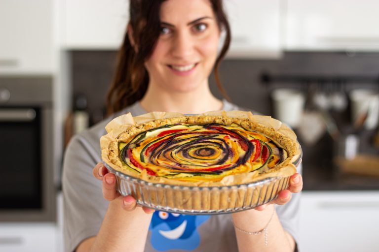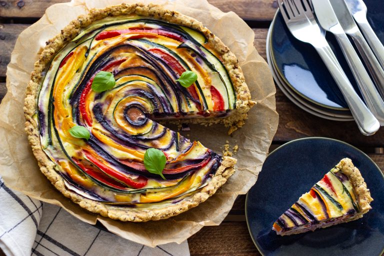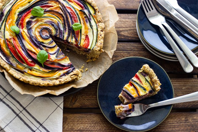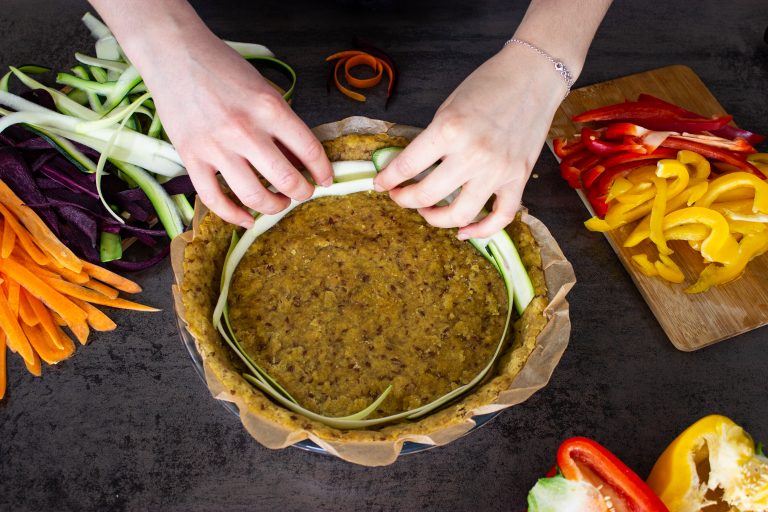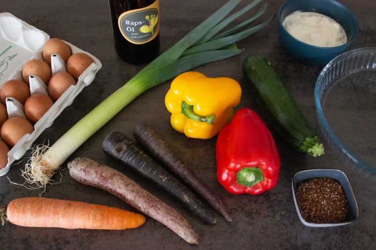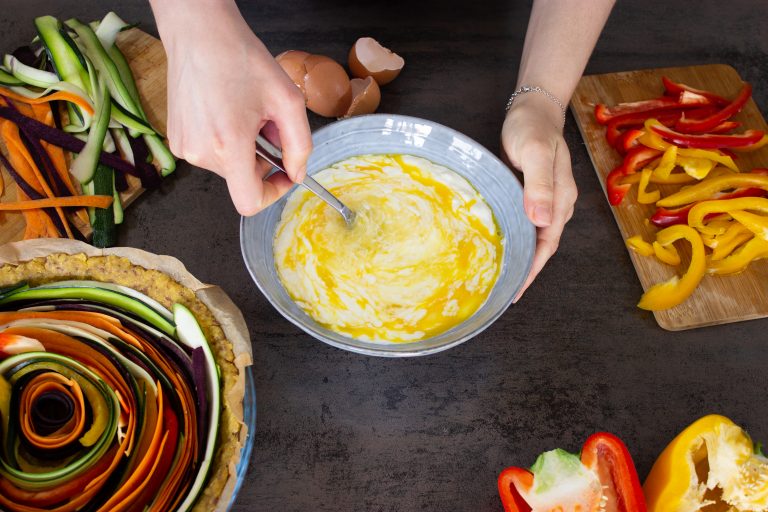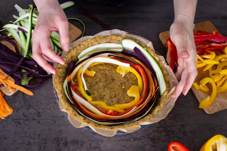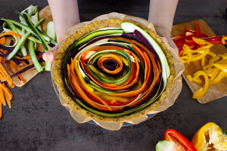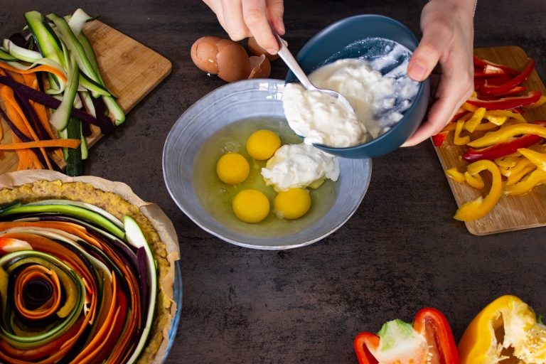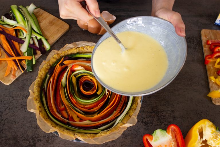Das Gemüse solange aufrollen, bis das Ganze in etwa die Größe der Tarteform hat. Mit Salz und Pfeffer würzen und mit Olivenöl bestreichen. Das Gemisch aus Eiern und saurer Sahne in die Tarte gießen. Wenn du mehr Gemüsestreifen übrig hast, kannst du diese gerne in die Spirale einfügen.