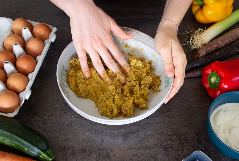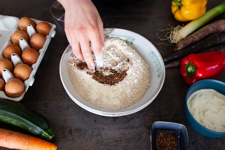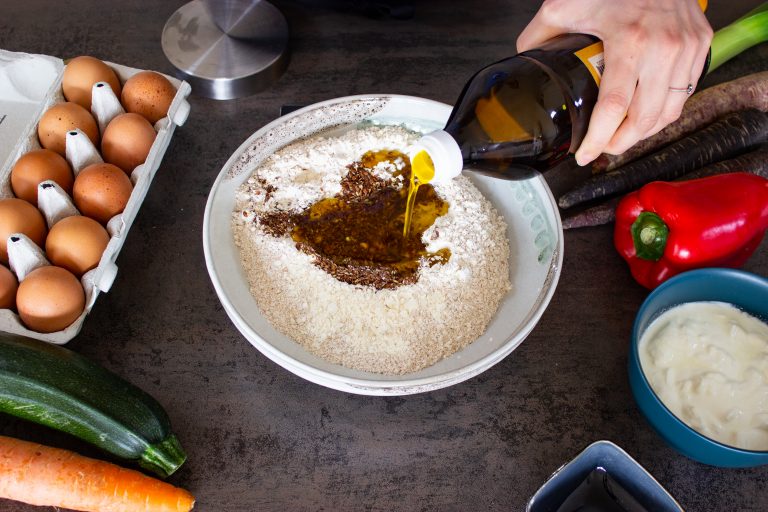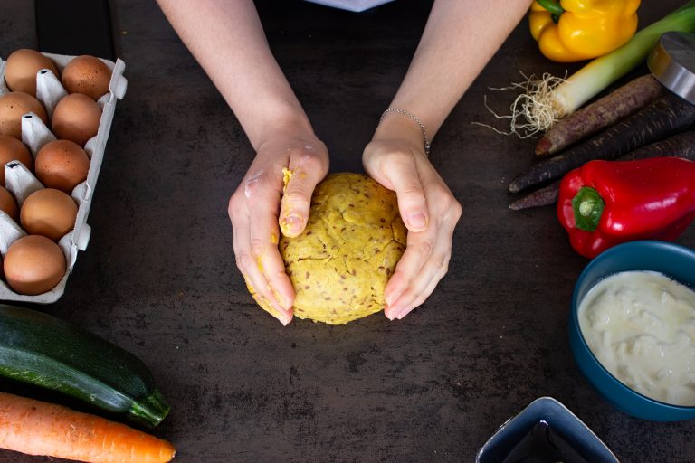 Mehl und Leinsamen in eine große Schüssel geben. Öl und Mehl zusammen verreiben bis Krümel entstehen. Wasser zugeben und zu einem glatten Teig kneten. Dabei schnell arbeiten, damit der Teig nicht zu warm wird. In Klarsichtfolie einschlagen und im Kühlschrank für 20/40 Minuten ruhen lassen.
