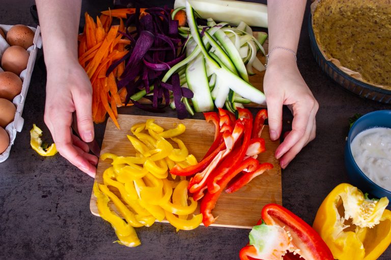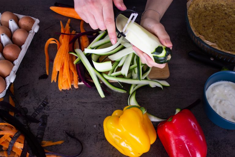 Gemüse waschen und mit einem Gemüsehobel in dünne Streifen schneiden.