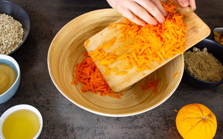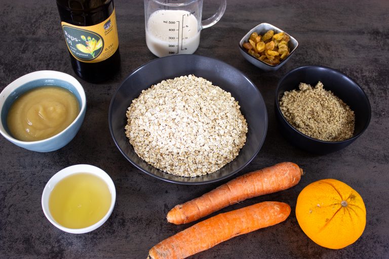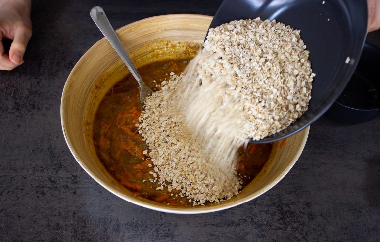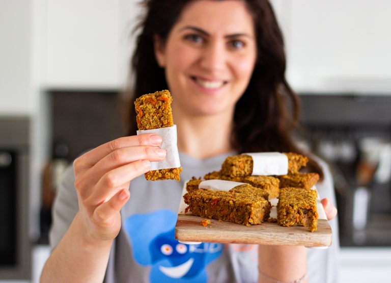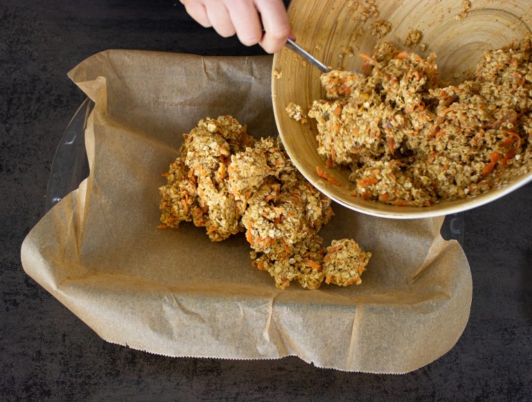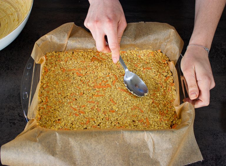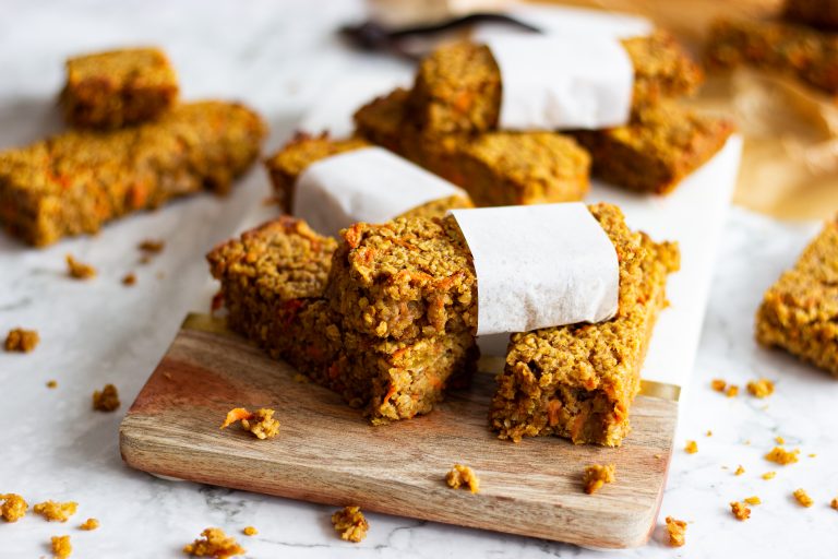 Ob bei der nächsten Radtour, auf dem Bolzplatz oder zuhause: Diese Karottenkuchen-Haferflocken-Frühstücksriegel sind als schnelles Frühstück für unterwegs oder als Snack geeignet. Dabei kommen sie ganz ohne Milchprodukte und raffinierten Zucker aus!