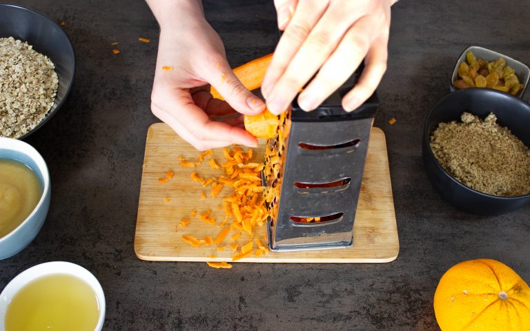 DAS BENÖTIGST DU: Reibe, Kuchenform (am besten quadratisch oder rechteckig), Schüssel, Löffel, Backpapier, Backofen