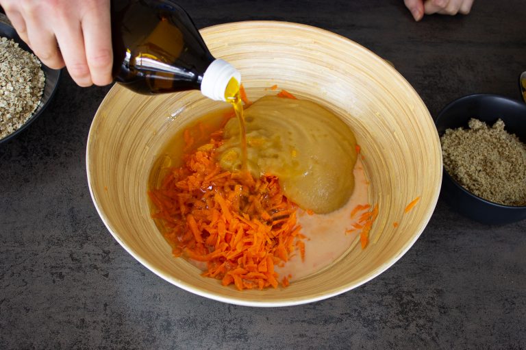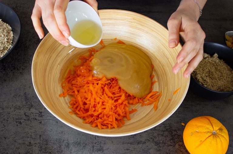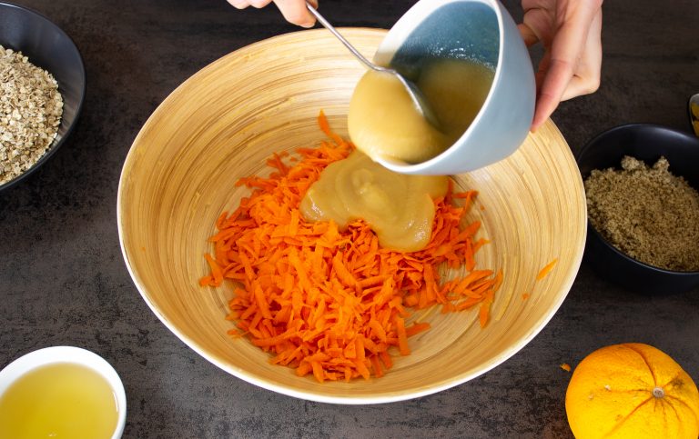 Möhren putzen und raspeln. Geraspelte Möhren, Apfelmus, Öl, Pflanzenmilch, Agavedickensaft und Orangensaft in einer Schüssel ordentlich vermischen. Salz, Zimt, Muskatnuss und Vanillezucker hinzufügen und verrühren. Die gemahlenen Mandeln und Haferflocken hinzufügen und alles zu einem Teig verrühren und anschließend in die Backform verteilen. Den Teig mit der Rückseite eines Löffels gut flachdrücken.