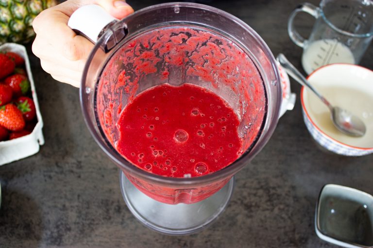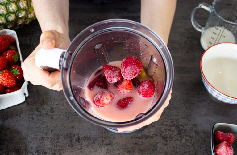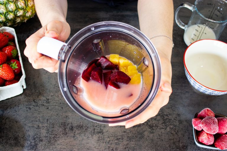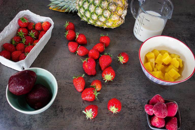 In einem Mixer Kokosmilch, Ananas mit ihrem Saft, gehackte Rote Bete und gefrorene Erdbeeren hineingeben.