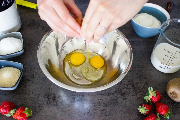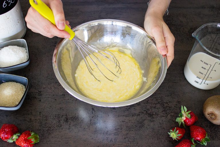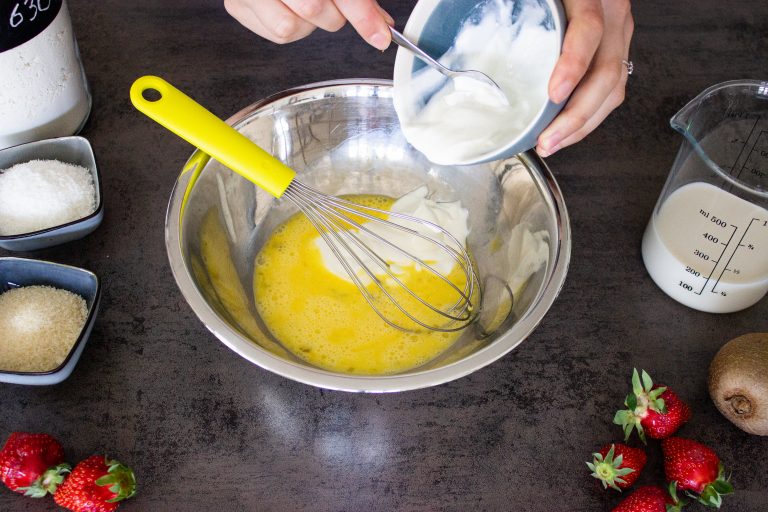 Die Eier und den Joghurt in eine Schüssel geben und mit einem Schneebesen verrühren. Die Kokosnussraspeln, Zucker und die Milch hinzufügen. Zum Schluss das Mehl und das Backpulver dazugeben und weiter verrühren.