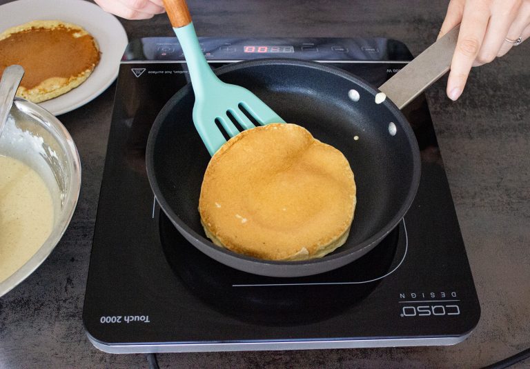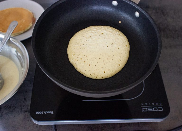 In einer Pfanne etwas Öl erhitzen – die Hitze sollte dabei auf eine mittlere Stufe eingestellt werden. Mit einem Schöpflöffel den Teig gleichmäßig in die Pfanne geben. Nun rund 2-3 Minuten von jeder Seite anbraten, bis die Pfannkuchen goldbraun sind.